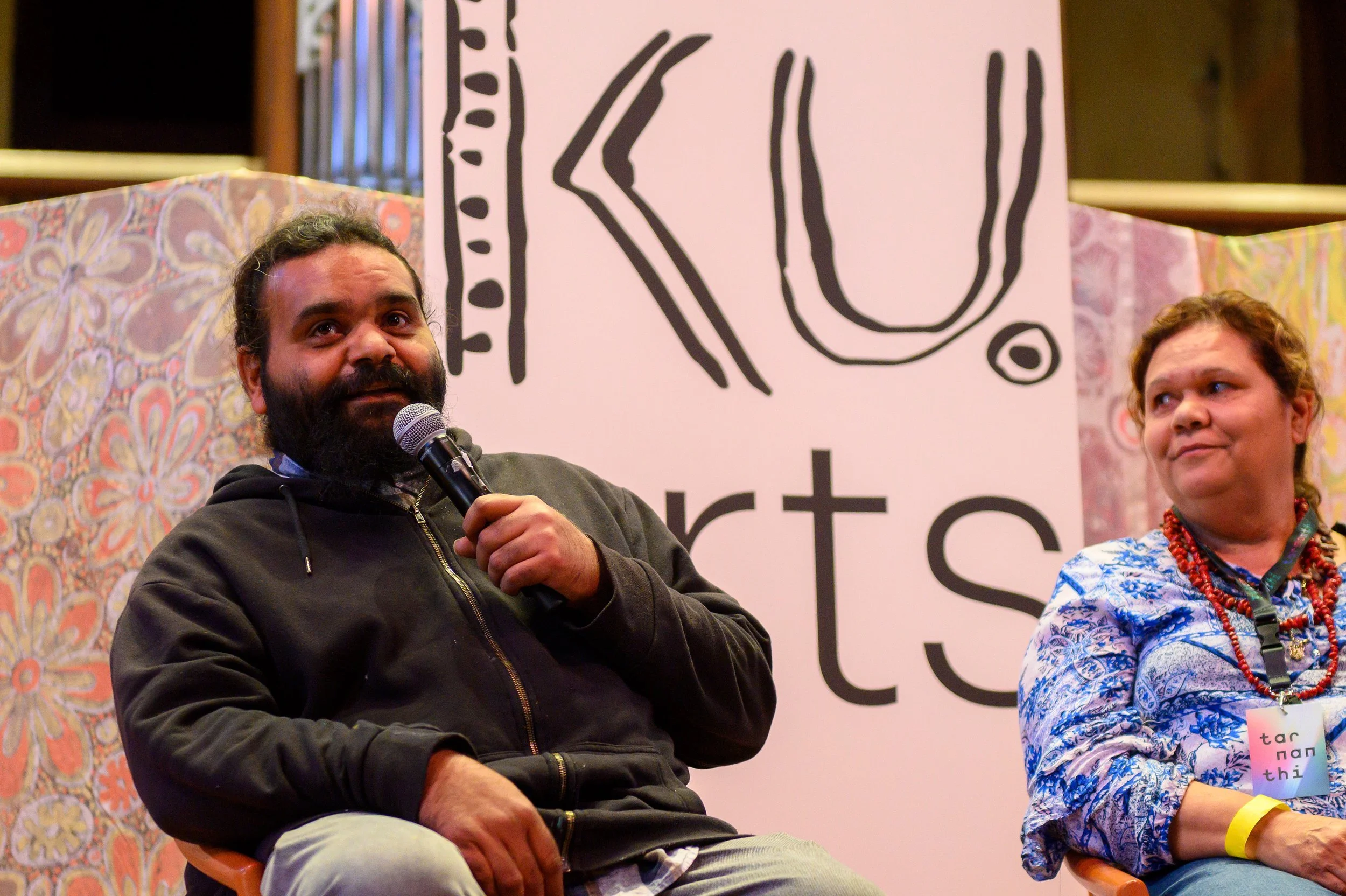 Image: Ku Arts board member Cedric Varcoe and artist Micky Barlow speaking at the 2019 Ku Arts Symposium.